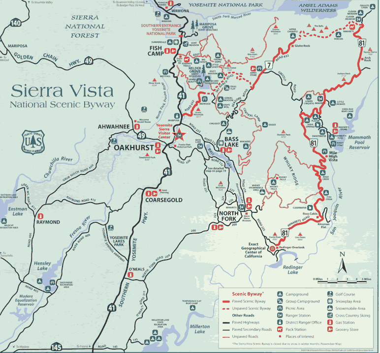 Sierra Vista Scenic Byway Der Sierra Vista Scenic Byway führt auf rund 85 mi / 140 km durch die Bergwelt des Sierra Vista National Forest, vorbei an Museen, dem Mittelpunkt von Kalifornien, Aussichtsplätzen über die Bergwelt und seinen Granitfelsen, die über Jahrtausende zu Domen geschliffen wurden. Startpunkt des Scenic Byways ist das Sierra Mono Museum in North Fork, der Abschluss bildet der Fresno Dome bzw. die Kreuzung auf den Hwy 41 nördlich von Oakhurst. Die geschätzte Fahrtzeit beträgt rund 2,5 Stunden, die durchschnittliche Zeit an den rund 10 Stopps an Aussichtsplätzen und Museen beträgt rund 4 Stunden.