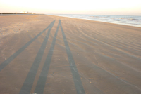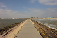 17. Tag: Lake Jackson - Galveston Es ist noch immer bewölkt als wir uns auf den Weg machen. Wir fahren nach Freeport an die Mündung des Hafeneinlasses, in der Hoffnung, von hier eine gute Aussicht auf das Meer und Hafen zu bekommen. Wie auch auf Padre Island kann man hier den Strand befahren, was wir selbstverständlich auch gleich tun. Auch hier ist der Strand breit und fest und scheint unendlich lang zu gehen. Die Häuser in der Gegend sind alle auf Stelzen gebaut, offensichtlich muss man hier mit Überschwemmungen rechnen. Allerdings sind diese Häuser alle schon alt und dementsprechend heruntergewirtschaftet - nicht besonders schön. Auch die Hafeneinmündung ist nicht schön, alles liegt mit Müll und angeschwemmten Zeug rum, so dass wir ohne anzuhalten zurückfahren. In großem Bogen geht es jetzt um mächtige petrochemische Anlagen herum auf die andere Seite zur Hafeneinfahrt, hier sollte ein kleiner Park sein. Und tatsächlich: Die Siedlung ist bereits merklich angenehmer, die Häuser sind noch schlicht, aber ordentlich - und alle auf Stelzen.