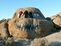 Die anschließende Fahrt über die Schotterpiste zum Little Lake Overlook wird für meine Mitfahrer zum Nervenkitzel, sind sie doch Fahrten abseits der geteerten Straßennicht gewöhnt. Hier werden wir noch echte Pionierarbeit leisten müssen. Auf jeden Fall gabs an dem Overlook ein Bier fuer die tapferen Mitfahrer, um die Nerven wieder etwas zu beruhigen. In Lone Pine angekommen schlagen die Herzen höher vor Begeisterung. Zugegeben, Lone Pine ist nicht unbedingt eine Stadt, in der was los ist, hat aber einen Western Flair erhalten. Richtig was los ist nur einmal im Jahr zu dem Maulesel Festival, wenn alle Menschen hier im Westernlook herumlaufen. Immerhin wurden hier in der Gegend eine Vielzahl von Western gedreht und die Portraits der Stars schmücken die Gänge der Motels und Wünde der Restaurants. Die Alabama Hills waren erwartungsgemäß ein Highlight, das die Herzen höher schlaen ließ. Ein letztes Bild zum Sonnenuntergang haben wir noch geschafft, leider geht die Sonne bereits um ca. 4 Uhr hinter den Bergen der Sierra Nevade, unter anderem mit dem Mt Whitney, dem höchsten Berg der USA, unter. Trotzdem bleibt es noch ausreichend hell, um sich die Wunder der Steinformationen in Ruhe anzuschauen.