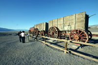 Die weitere Fahrt ins Death Valley verlief problemlos und ist landschaftlich bereits ein echter Hinkucker. Ewige Weiten mit blondem Gras wechseln sich mit Hügeln und schroffen Felsen ab, dazwischen ein rund 1000m tiefes Tal und immer wieder Joshua Trees auf den Weiten. Das Wetter war sonnig, aber dazu ging ein mächtiger kalter Wind, der einen fast von den Aussichtsstellen weggeblasen hätte. Hoffentlich ist es nicht so windig, wenn wir unsere Harleys mieten ...