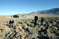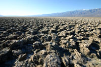 5. Tag: Death Valley und Las Vegas Der Tag beginnt mit einem guten Frühstück im Café der Lodge: Eier mit Speck bzw ein Omlett, dazu Kaffee bis zum abwinken und Wasser gegen den Durst. So sollten wir den Tag bis zum Abend mit dem Buffet im Luxor überstehen können. Wir fahren bei tiefliegender Morgensonne das Tal in Richtung Süden hinunten. Bei Devils Golfcourse halten wir an und laufen etwas auf den verkrusteten Erdschollen herum. Die Erde ist beim Trocknen hier so aufgeplatzt, dass es aussieht, als hätte jemand einen harten Boden gezackert. An anderen Stellen im Park bleibt einfach Sand übrig oder es gibt kleine Schollen - wie vielfältig die Natur doch sein kann.