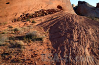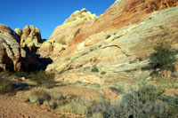Weiter gehts durch den Valley of Fire SP mit leuchtenden Steinen, die Sonne geht schon wieder langsam unter. Wir schieben den kurzen Rundgang hinten im Tal ein, wo auch der Star Treck "Treffen der Generationen" gedreht wurde. Schon die Fahrt hinter ist ein Erlebnis, in engen Kurven und vielen Berg und Talfahrten führt der Weg in das Valley hinter. Vorbei an roten Felsen, die in der tiefstehenden Sonne zu glühen scheinen, durchmischt von gelben und anderem hellen Gestein.