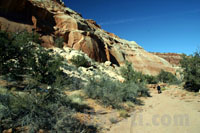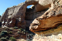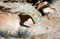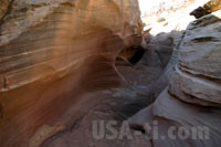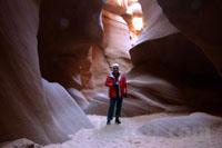 Der Weg führt entlang eines Washes, einem ausgetrockneten FLusslaufs. Der Boden ist sandig, was das Fortkommen anstrengend macht, hin und wieder verengt sich der Verlauf oder wir müssen einen kleinen Wasserfall hinauf klettern oder durch einen "Mini-Slotcanyon" durch kriechen. Alternativ gibt es meist einen Weg über die Böschung, um die Kletterei zu umgehen. Nach ca. 1,5 Meilen sollte eigentlich der Birthday Arch zu sehen sein, aber irgendwie ist weit und breit nichts von dem verflixten Ding zu sehen. Also gehen wir immer weiter bis wir im einen Tal an das Ende gelangen, ein Abschluss mit einem Wasserfall. Im anderen Tal finde ich einen kurzen, aber tief eingeschnittenen Slotcanyon, echt impossant aber noch immer kein Arch weit und breit. Unser Latein ist am Ende und wir kehren um - und da entdecken wir den Arch. Ich rase noch schnell den Sandhügel hinauf um noch ein paar Fotos zu schießen, meine Mitfahrer ziehen es vor, direkt weiter in Richtung Auto zu gehen.