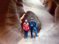 Am Antelope Canyon erfahren wir, dass sie die Touristen nur noch in Touren durch den Canyon lassen - zum Schutz vor Kritzeleien in den Felswänden. Es gibt aber auch die Möglichkeit, einen 2 Stunden Pass für Fotographen mit Spiegelreflexkamera und Stativ zu bekommen. Leider konnte ich nur einen Pass für 2 Personen rausleihern, so dass ich mit Ingrid vorgegangen sind und Sina und Dieter auf die Tour gewartet haben. Der Eingang ist unscheinbar und wir zwängen unsere Bäuche in den Slotcanyon, doch dann steigen die ausgewaschenen Wände zig Meter hoch an. Die Sandsteinwände sind in unterschiedlichen Farbschichten und Formen ausgewaschen und sind ein echtes Spektakel. Wir sind noch nicht weit gekommen als wir doch von Sina und Dieter eingeholt weden, der Aufpasser hatte ein Einsehen und hat die Beiden doch so in den Canyon reingelassen. Und so hatten wir den Canyon ganz für uns vier alleine, die Gruppe hat uns mit lauten Geschrei erst beim Aussteigen eingeholt. Was für ein Glück für uns !