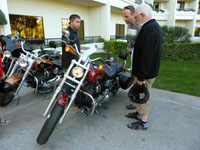 19. Tag: Mit dem Motorrad durch den Joshua Tree NP Wir haben geschlafen wie ein Murmeltier, Dieter und Ingrid klagen etwas über den lärm, den die Vending Machines gemacht haben. Aber das Frühstück entschädigt jeglichen Schlafentzug. Eier mit Speck, dazu Hash Prawns und Toast sowie Kaffee soviel der Ranzen vertragen kann. Bisher waren Dieter und Ingrid immer ca. 5 Minuten vor der vereinbarten eit bei uns am Zimmer oder am Auto, um entweder in Richtung Frühstück oder zum Beladen des Autos zu drängeln. Heute jedoch ist mieman weit und breit in Sicht. Ich also zum Zimmer der beiden, und da erfahre ich: "Mir ha#m verschlafen". Und das ausgerechnet an dem Tag, an dem wir die Harleys mieten und durch den Joshua Tree NP fahren wollen. Also sind wir nicht wie gewollt um 9:00 Uhr sondern erst eine halbe oder gar ganze Stunde später beim Eagle Rider, unserem Vermieter. Dieter weiß bisher noch nichts von seinem Glück, und die Kinnlade bekommt er gar nicht mehr zu, als ich die Mietverträge rausziehe und er seinen Führerschein vorzeigen soll. Dann dauert es nur noch ca. 1 Stunde für die Übergabe, und schon haben wir die Harleys unter unseren Hintern.