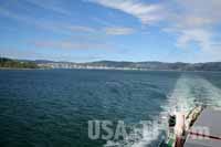11. Tag: Von Wellington nach Nelson Der Wecker reißt uns um 7:45 Uhr aus dem wohltuenden, erholsamen Schalf. Wir schrecken auf und machen uns gleich daran, alls zu packen, zu duschen und alles im Auto zu verstauen. Wir müssen um 9:00 Uhr das Auto abgeben und uns zur Fähre zur Südinsel machen. Den Mietwagen dürfen wir nicht mitnehmen, was uns Sorge wegen dem ganzen Gepäck bereitet - wie sollen wir den Berg denn aufs Schiff transportieren? Wir erreichen die Mietwagenstation fast pünktlich und geben den Wagen ab. Komischer weise hat er das letzte mal gequietscht, als wir losgefahren sind, und danach ist Stille eingekehrt. Trotzdem teilen wir den Vorfall ordnungsgemäß mit, doch das scheint nicht wirklich zu interessieren - egal, wir sind das Problem los. Das Gepäck nimmt man gar nicht selbst mit auf das Schiff, es wird aufgegeben wie beim Flugzeug, somit wäre auch die Schlepperei gelöst und wir besteigen mit unserem Handgepäck den Dampfer. Die Überfahrt dauert ca. 3 bis 4 Stunden und wir haben ruhige See.
