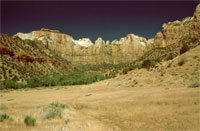Der Zion NP wurde am 19. November 1919 gegründet und umfaßt 593 km². Der größte Teil der Besucher begrenzen ihren Aufenthalt auf den Südteil mit dem endrucksvollen Zion Canyon. Der mittlere Teil sowie die im Norden gelegenen Kolob Canyons (beide nicht mit dem Straßensystem im Park vom Zion Canyon aus erreichbar) bleibt von den Besuchermassen weitgehend verschont.