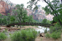 Der Zion Canyon Scenic Drive endet am Tempel of Sinawava. Hier beginnt ein rund 1,5 km langer, befestigter Weg entlang des Virgin Rivers zum Gateway of the Narrows, den so gut wie keiner der Besucher ausläßt. Hier endet der befestigte Weg, da zwischen Fels und Wasser kein Platz mehr für einen Weg zur Verfügung steht. Bei niedrigem Wasserstand kann man den Fluss überqueren und einem Trampelpfad ein Stück weiter in die Schlucht folgen, bis der Fluss den gesamten Raum zwischen den Felswänden einnimmt. Um die wirklichen Zion Narrows zu sehen muss mittels mühsamem Waten und Klettern wesentlich weiter in den Canyon vorgedrungen werden. Dann erlebt man den sagenhaften Anblick der teilweise nur wenige Meter engen, bis zu 600 m hohen Sandsteinwände, durch die der Virgin River die Schlucht geschliffen hat. Vorrraussetzung ist, dass in der gesamten Gegend kein Regen fällt. Der Wasserstand im Canyon steigt ansonsten so schnell und so stark an, dass das ruhige Flüsschen innerhalb kürzester Zeit zum reißenden Gewässer anschwillt. |