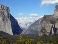 Tunnel View Wenn Sie das Yosemite Valley von Süden aus Richtung Wawona anfahren oder das Valley in Richtung Süden verlassen, ist vor bzw. nach dem Tunnel in der Taleinfahrt ein Aussichtspunkt, den Sie ebenso wie alle anderen Besucher nicht auslassen sollten. Von hier aus erleben Sie einen grandiosen Einblick der Länge nach in das Valley mit dem senkrechten Felsen El Capitan auf der einen Seite und Bridalveil Falls auf der anderen. Dazwischen, nahezu unwirklich, das flache Tal eingeschlossen zwischen den Felsgiganten.