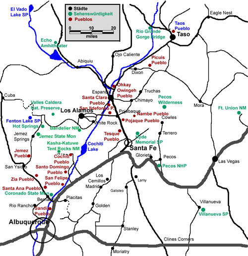 Der Fenton Lake SP liegt am Hwy 126, wenige Meilen nördlich vom Abzweig vom Hwy 4 in Richtung Cuba. Der Fenton Lake ist ein bekannter Ausflugsort für Angler, die in dem Stausee ihrer Beute nachjagen. Man kann um den See herum aber auch schöne Spaziergänge unternehmen, es gibt einen Camping- und Picknickplatz in wundervoller Kulisse. Wenige Meilen südlich des Abzweigs Hwy 126 befindet sich am Hwy 4 eine heiße Quelle im Wald. Erreicht wird die heiße Quelle auf einem Pfad, der etwa 200 m unterhalb des Dark Canyon Picknickplatzes an einer Ausbuchtung der Straße beginnt. Der Weg ist hinter dem Bach, der über einen Baumstamm zu überqueren ist, durch ein Schild "Spring Trail" ausgeschildert. Der Hyde Park Memorial SP liegt rund 16 km/ 10 mi nordöstlich von Santa Fe in den Bergen unterhalb der Santa Fe Ski Area am Littel Tesuque Creek. Im Winter viel Schnee für Wintersportarten. Im Sommer schöne Aussicht und klare Luft. Der Park bietet einen guten Ausgangpunkt für ausgedehnte Wanderungen in den Bergen oder einem ruhigen Picknick in wundevoller Umgebung. Das Jemez State Monument liegt am Hwy 4 etwas nördlich von Jemez Springs. Zu sehen ist ein Teil der Ruinen des ehemaligen Jemez Pueblos (der Rest des Pueblos wurde nicht freigelegt) und der Missionskirche San José, die teilweise restauriert wurde. Die Kirche wurde um 1620 an der bereits seit dem 14. Jahrhundert bestehenden Siedlung erbaut. Kasha-Katuwe Tent Rocks National Monument Tolle Bergformationen mit Überresten von Auswaschungen eines ursprüngliche vulkanischen Gesteins, die wie runde Indianerzelte aussehen. Im National Monument kann der Cave Loop Trail (ca. 2 km / 1,2 mi lang, einfach) oder der Canyon Trail (ca. 2,4 km / 1,5 mi lang, steiler Anstieg, anstrengend) begangen werden. Los Alamos Los Alamos wurde im 2. Weltkrieg erschaffen, um in der damaligen Abgeschiedenheit die Atombombe zu entwickeln. Nähere Informationen unter dem Städte-Highlight Los Alamos. Pecos NHP (National Historic Park) Zu sehen sind die Grundmauern eines gigantischen Pueblos, mit dessen Erbauung 1100 n. Chr. begonnen hatte. Im Jahre 1450 besaß Pecos bereits zahlreiche mehrstöckige Gebäude, zentral um einen Platz gruppiert. Bei Ankunft der Spanier war Pecas eines der größten Pueblos und zählte rund 2000 Einwohner. In New Mexico existierten, vor der europäischen Eroberung der Gegend, über 100 Pueblos (spanisch: Dorf, Siedlung). Heute sind noch 19 Pueblos bewohnt. Die Pueblos wurden entweder aus Stein (dabei wurde eine art Mörtel aus Sand, Lehm und Wasser verwendet) oder in Adobe-Bauweise (ungebrannter Lehm) erbaut, die Wände wurden teilweise mit einem hellbraunen Lehm verputzt. Ohkay Owingeh Pueblo: Schöne, teilweise jahrhunderte alte Adobe-Häuser und zwei Steinkirchen, die in den einheitlichen Stil so passen, wie Plattenbauten in eine Altstadt: Die Lady of Lourdes Chapel ist aus Stein gebaut, die St. John the Baptist besitzt eine Backsteinfassade. Ohkay Owingeh bedeutet "Platz der starken Menschen" und machte zu der Zeit der Revolte bis 1598 der Pueblo-Indianer seinem Namen alle Ehre. Das Dorf war das Hauptquartier des Eight Northern Indian Pueblo Council (acht nördliche Indianer-Pueblo Council), dessen Führer aus der Siedlung stammte. Nachdem der Aufstand 1598 von den Spaniern niedergeschlagen wurde, wurde das Dorf von dem spanischen Conquistador Don Juan de Oñate in San Juan Pueblo umbenannt. Erst im November 2005 wurde dem Dorf sein ursprünglicher, spanischer Name zurückgegeben. |