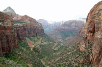 Kurz vor dem langen und spektakulären Zion Mt. Carmel Tunnel führt ein ca. 1,6 km (hin und zurück) langer Trail hoch über den engen Windungen des Pine Creek zum Canyon Overlook. Von hier aus besteht ein schöner Blick über das Tal, bis hinüber zu den Towers of Virgin. Die Straße verschwindet dann bei Fahrt in Richtung Westen in den 1,8 km langen, dunklen Zion Mt. Carmel Tunnel und kommt unter blauem Himmel wieder zum Vorschein. Der Tunnel wurde 1930 fertiggestellt, kostete rund eine halbe Million Dollar und forderte zwei Menschenleben. Die Straße führt in engen Spitzkehren entlang der Flanken des Pine Creek Canyons mit einer Vielzahl von phantastischen Aussichten, wie auf den Great Arch, hinunter ins Tal. |