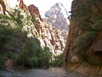 Der Zion Canyon Scenic Drive endet am Tempel of Sinawava. Hier beginnt ein rund 1,5 km langer, befestigter Weg entlang des Virgin Rivers zum Gateway of the Narrows, den so gut wie keiner der Besucher ausläßt. Hier endet der befestigte Weg, da zwischen Fels und Wasser kein Platz mehr für einen Weg zur Verfügung steht. Bei niedrigem Wasserstand kann man den Fluss überqueren und einem Trampelpfad ein Stück weiter in die Schlucht folgen, bis der Fluss den gesamten Raum zwischen den Felswänden einnimmt. Um die wirklichen Zion Narrows zu sehen muss mittels mühsamem Waten und Klettern wesentlich weiter in den Canyon vorgedrungen werden. Dann erlebt man den sagenhaften Anblick der teilweise nur wenige Meter engen, bis zu 600 m hohen Sandsteinwände, durch die der Virgin River die Schlucht geschliffen hat. Vorrraussetzung ist, dass in der gesamten Gegend kein Regen fällt. Der Wasserstand im Canyon steigt ansonsten so schnell und so stark an, dass das ruhige Flüsschen innerhalb kürzester Zeit zum reißenden Gewässer anschwillt. |